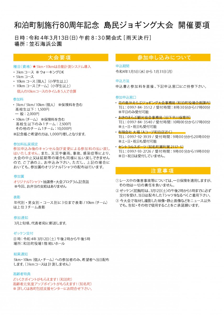(開催要項)の通り「和泊町制施行80周年記念 島民ジョギング大会」として、令和4年3月13日(日)に開催することを計画しております。