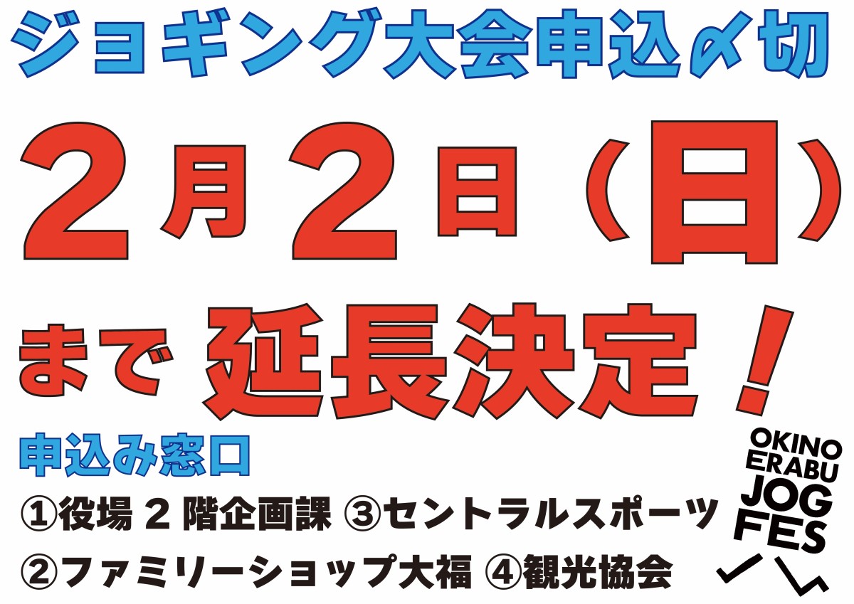 第41回花の島沖えらぶジョギング大会の申込締切日は、1月26日(日)となっておりましたが、週末にかけてお申し込みを多数いただいておりましたので、ネット申込み及び島内窓口での受付を2/2(日)まで延長することを決定しました!!!