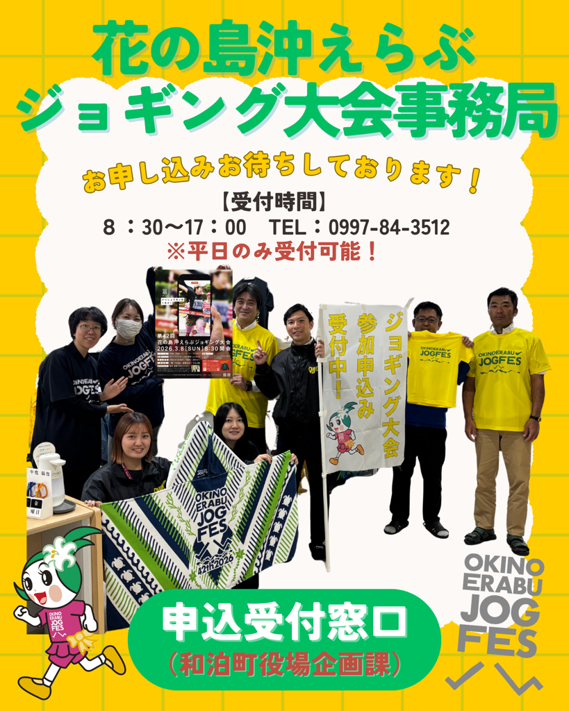 【和泊町役場2階「花の島沖えらぶジョギング大会事務局(和泊町企画課内)」】