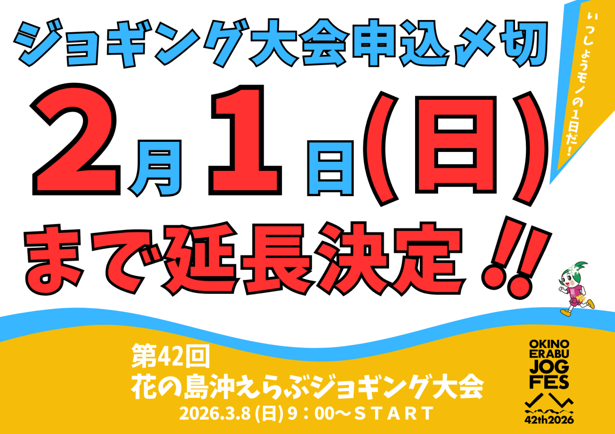 第42回花の島沖えらぶジョギング大会の申込締切日は、1月25日(日)となっておりましたが、ネット申込み及び島内窓口での受付を2/1(日)まで延長することを決定しました!!!