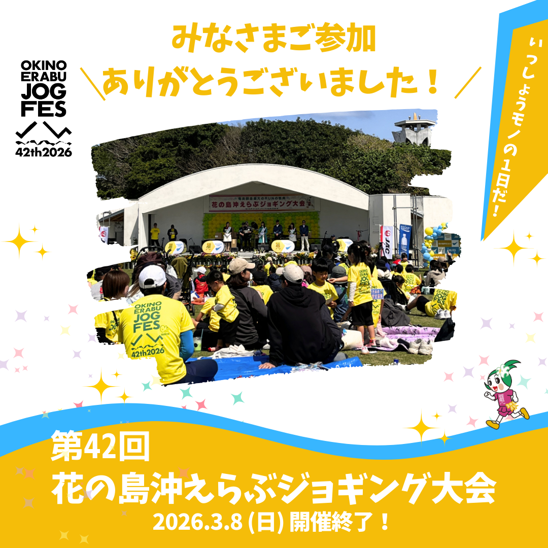 「第42回花の島沖えらぶジョギング大会」について、大きな事故などもなく、前夜祭「フラワーフェスティバル」~ジョギング大会~後夜祭「完走パーティー」まで無事盛大に開催することができました👏🏻🎉🎉